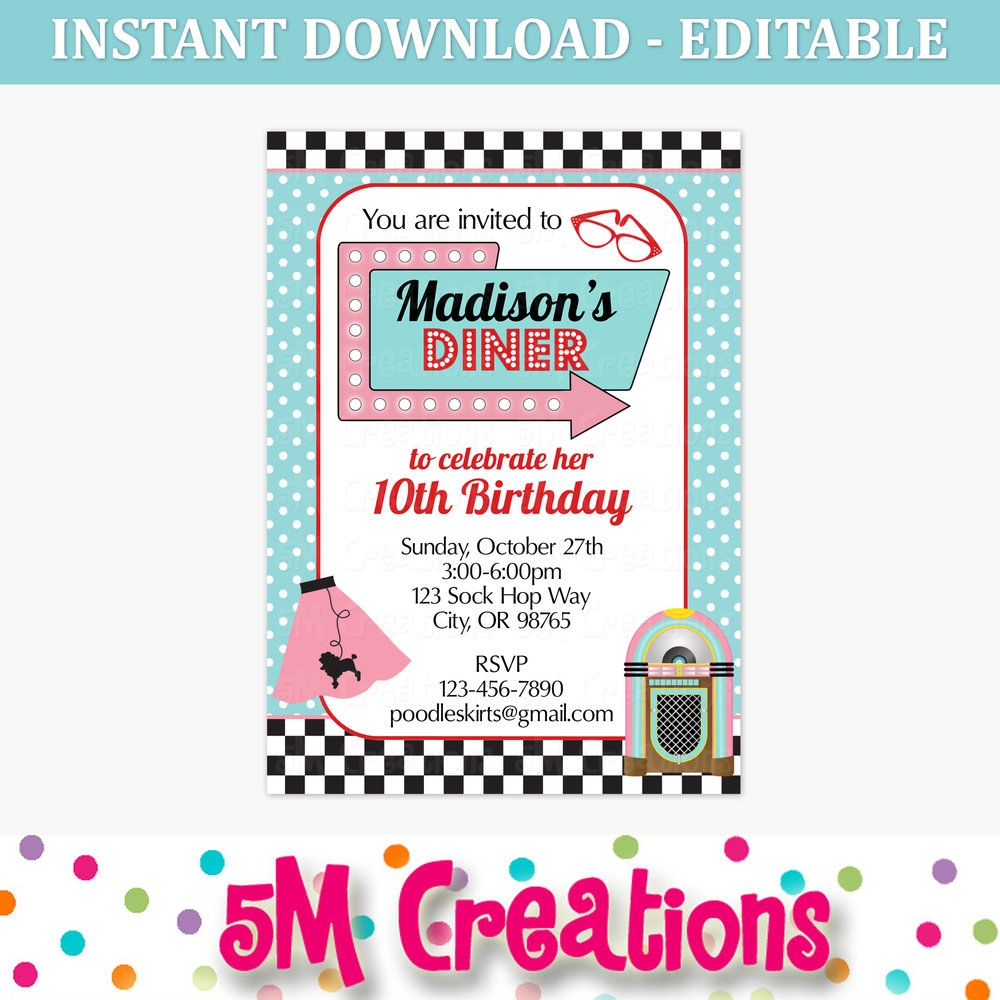50s Diner Birthday Party Invitation Editable Printable Digital File 5M Creations Blog
