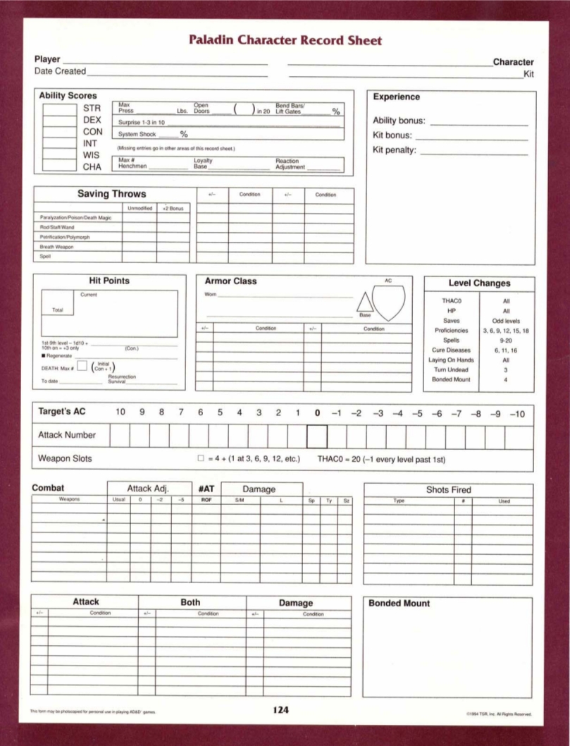 Jade Gaming News 2nd Ed AD D Paladin Character Sheet