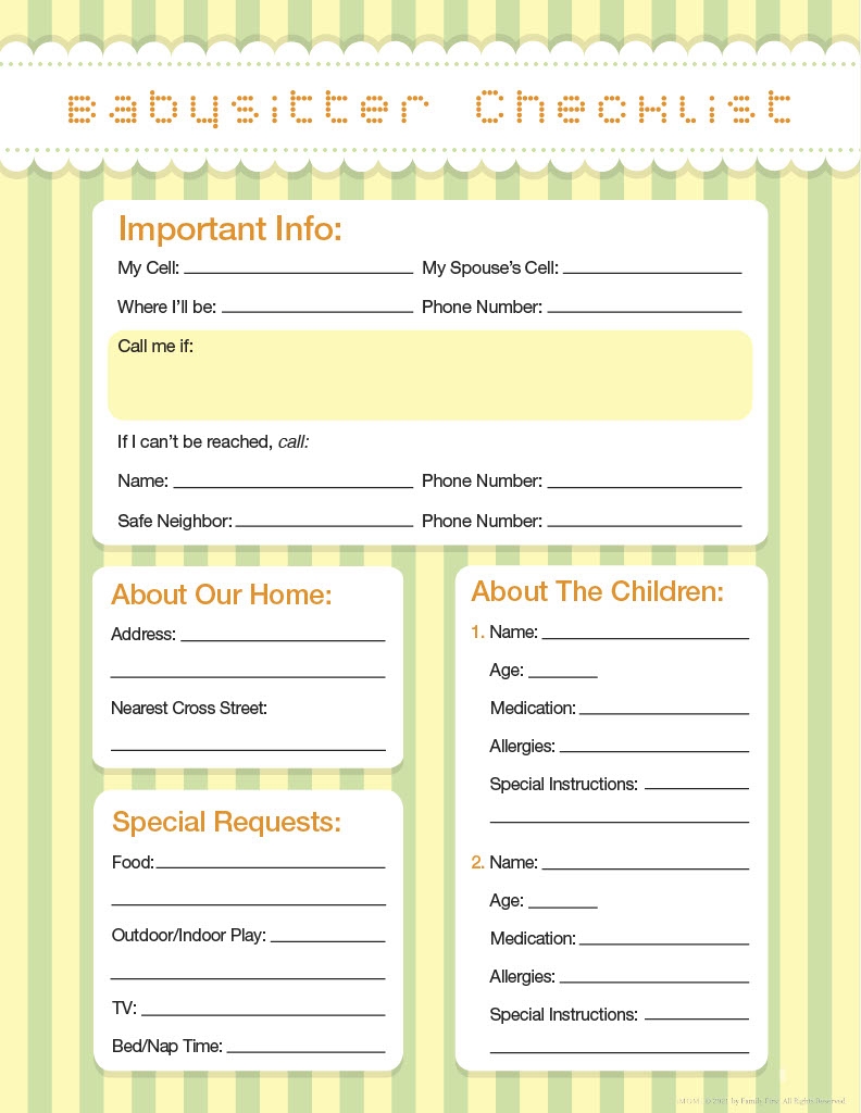 Babysitter’s Checklist Printable Editable