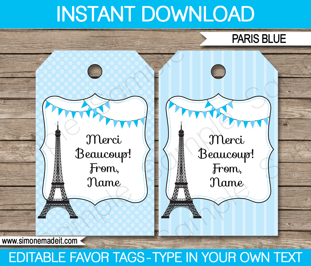 Blue Paris Birthday Party Favor Tags Template Printable Thank You Tags