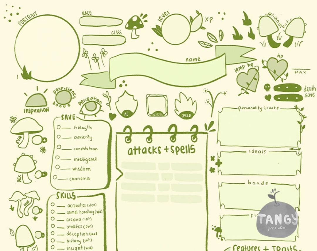 D D 5e Character Sheet PDF Printable For Dungeons And Dragons Mushroom Cute Sketchy Style Etsy