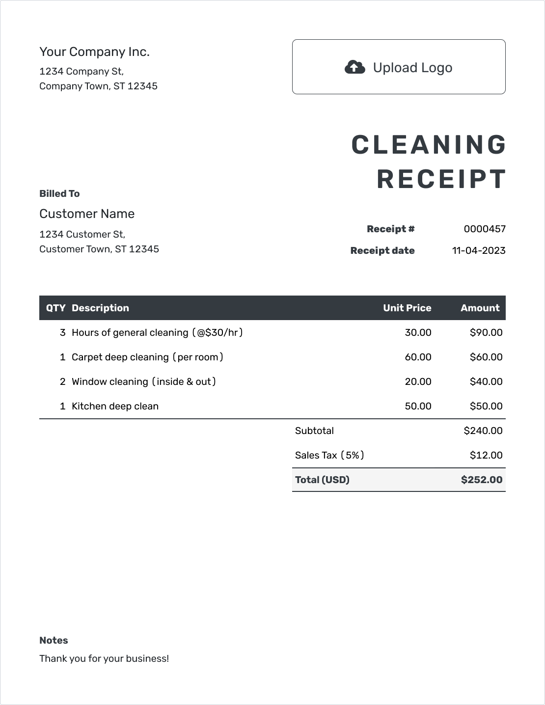 Start using our editable and printable cleaning invoice template to create professional invoices that reflect the quality of your cleaning services. Streamline your billing process, enhance your brand image, and ensure timely payments from your clients. Download our template now and take your cleaning business to the next level!