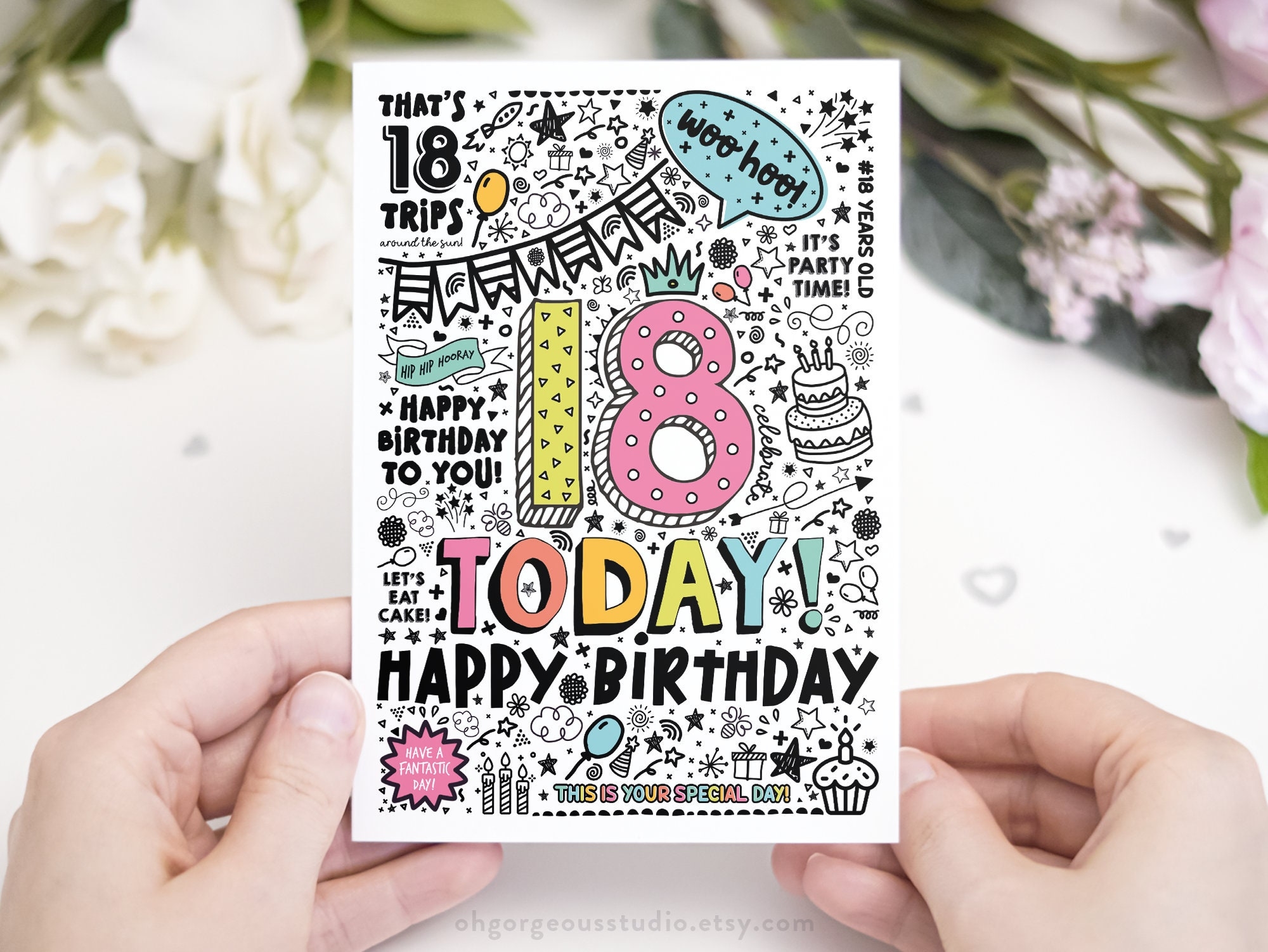 Printable 18th Birthday Card Instant Download Printable Card For 18th Birthday Digital Download Doodle Style Printable Birthday Card Etsy