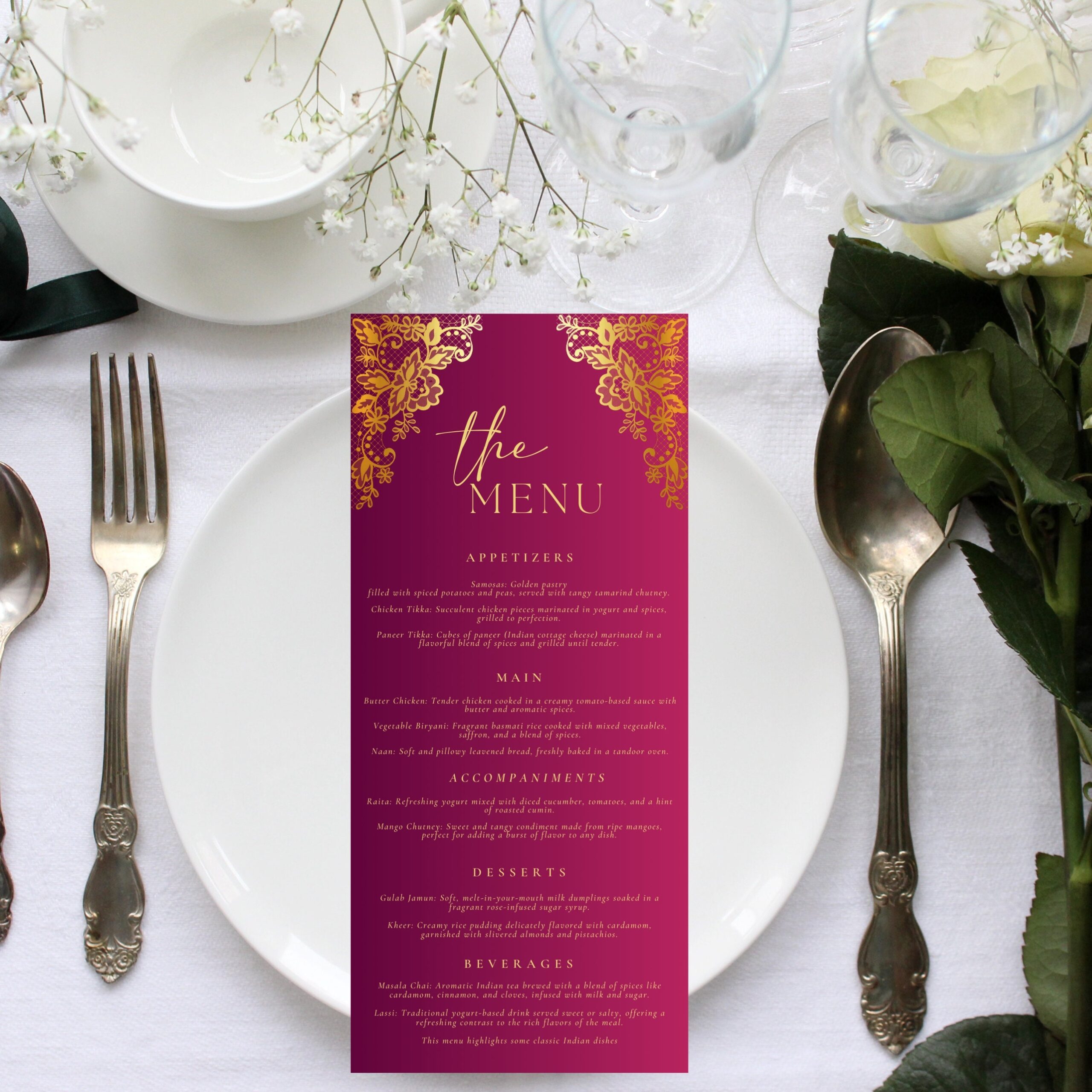The maroon and gold color scheme adds a touch of sophistication to your menu, while the editable format allows you to make changes as needed. Say goodbye to expensive printing costs and time-consuming design processes – our template makes it easy to create a professional-looking menu in minutes.