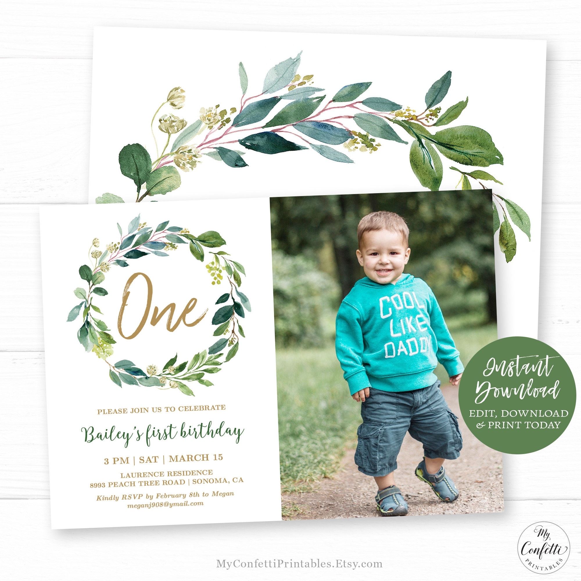 Greenery First Birthday Invitation EDITABLE Printable Baby 1st Birthday Photo Invitation Template Neutral One Boy Girl MCP815 CJB Etsy