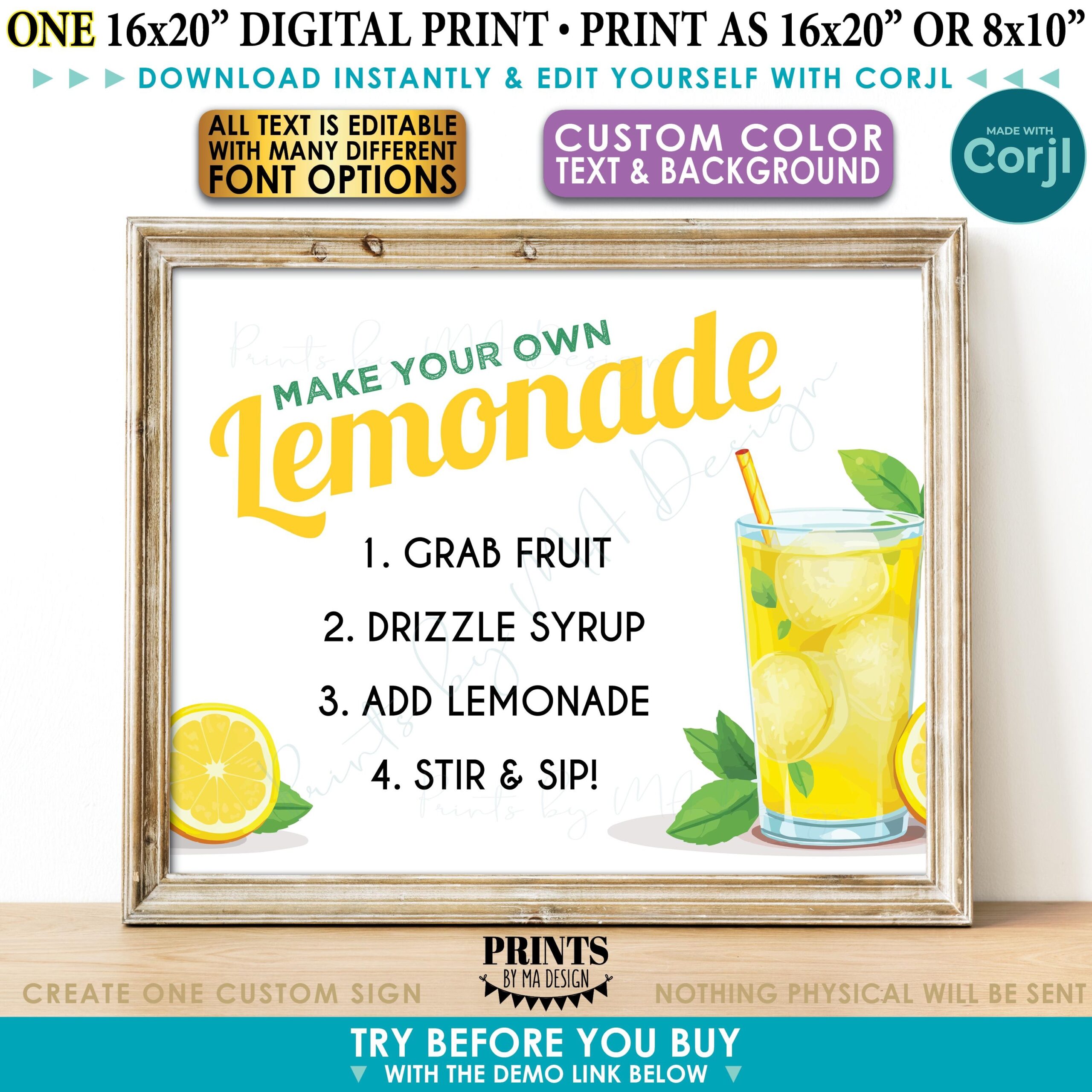 Editable Lemonade Sign Make Your Own Drink Choose Your Text Colors One Custom PRINTABLE 8×10 16×20 Sign