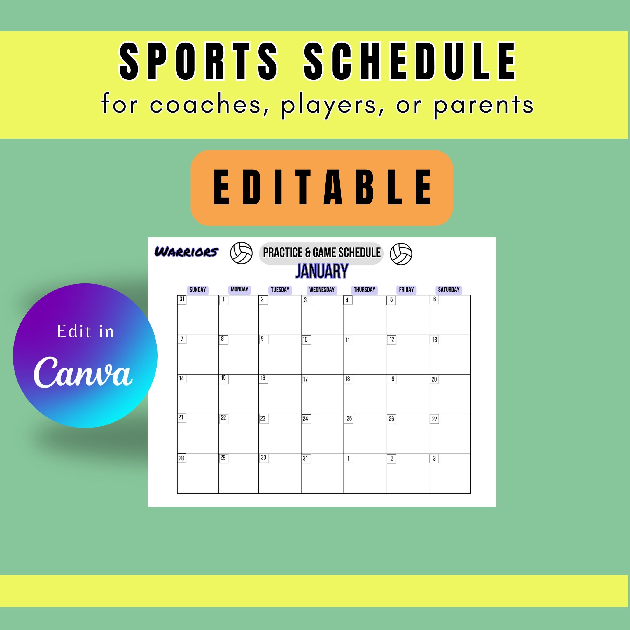 Editable Sports Schedule Sports Calendar Editable Team Calendar Team Mom Schedule Schedule For Coach Etsy