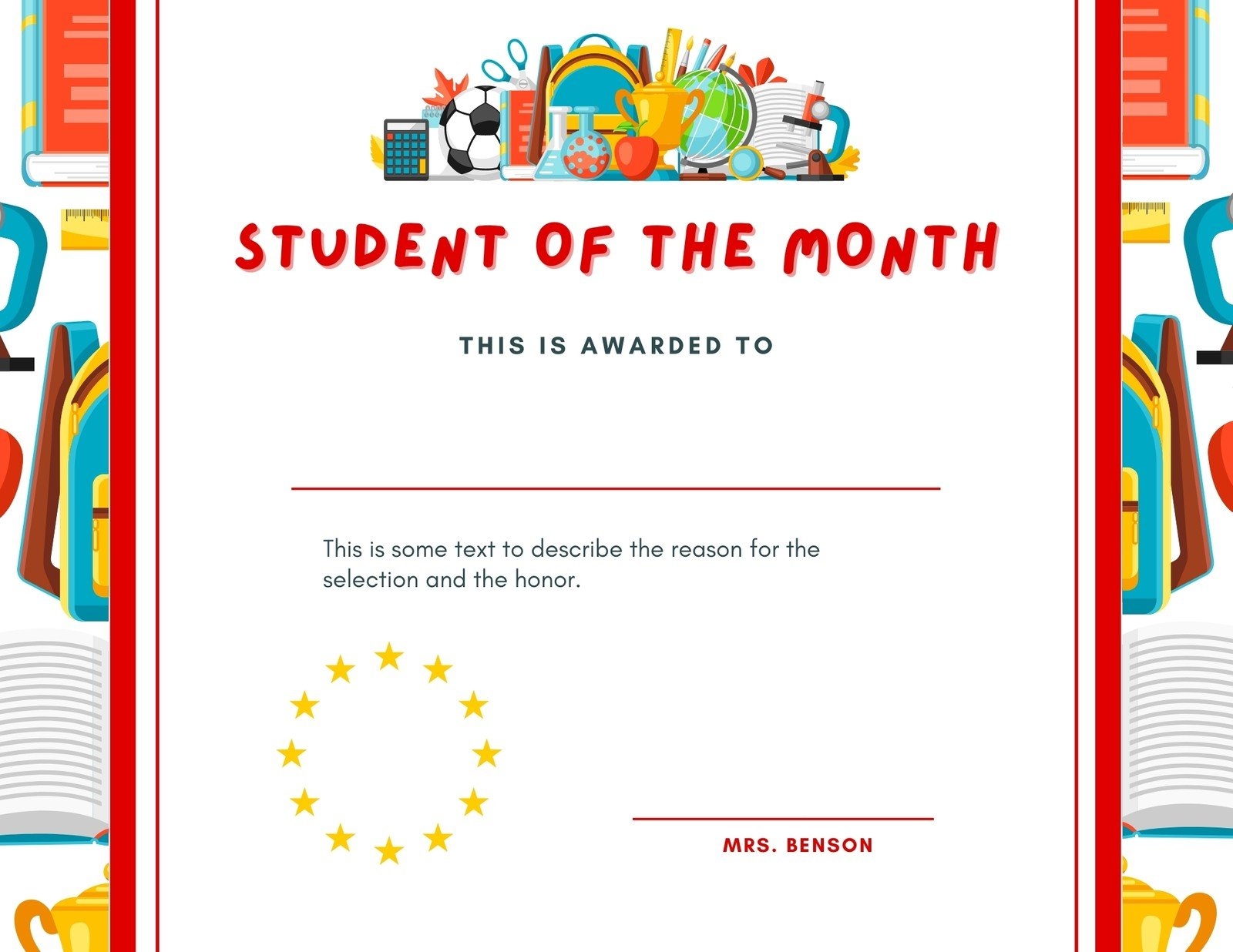 Our editable student of the month certificate template allows you to add the student’s name, the reason for the award, and the date of recognition. You can personalize it with your school’s logo or colors to make it even more special.