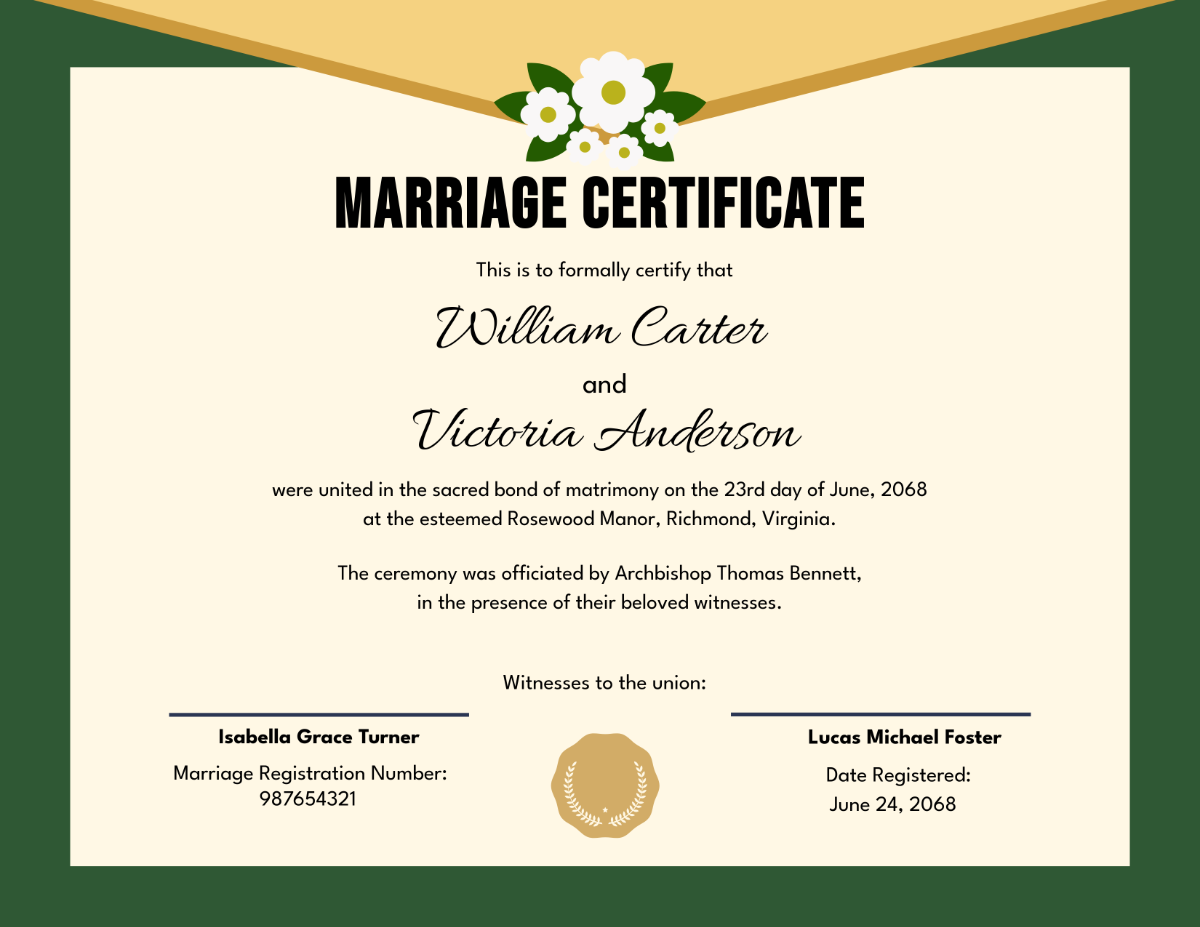 Celebrate your love in style with a personalized marriage certificate that you can edit and print for free. Create a lasting memory of your special day with our customizable templates. Get started today and make your wedding day even more unforgettable!