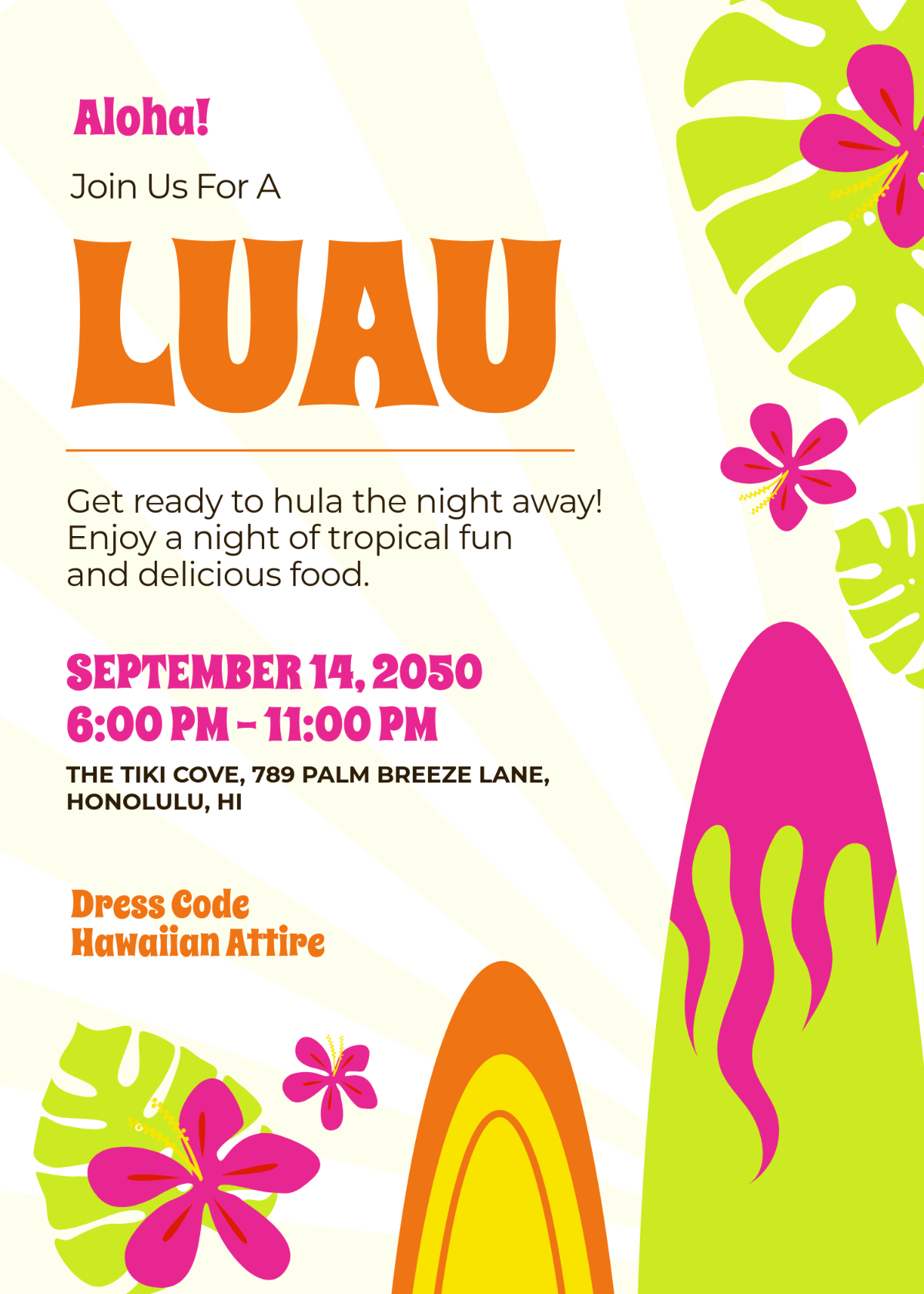 Impress your guests with professionally designed invitations that reflect the spirit of your Hawaiian party. From tropical flowers to palm trees, our templates capture the essence of a paradise getaway right on your invite. Your guests won’t be able to resist the allure of your upcoming event!