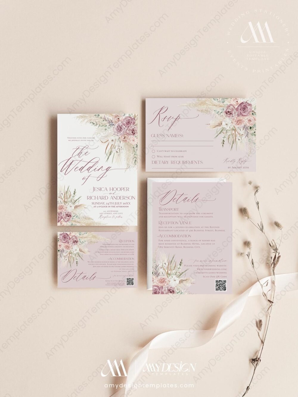 Mauve Rose Watercolor Wedding Invitation Suite, Printable, Editable Template, Instant Download