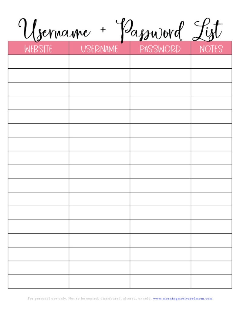 With a passwords list, you can easily write down all your passwords in one place. You can then print it out and keep it somewhere safe, or you can type them into a digital document and update it whenever you need to make changes.