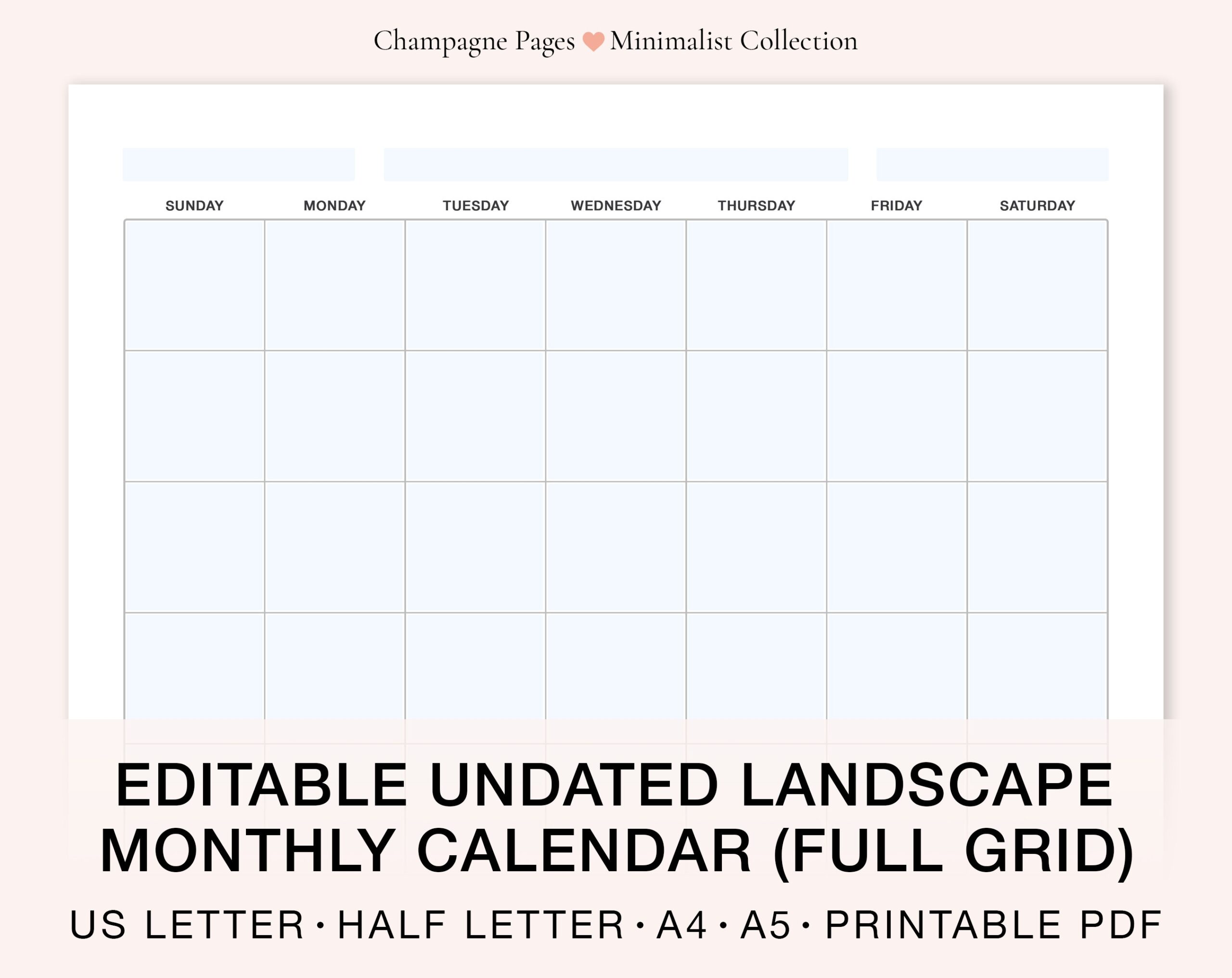 Landscape Editable fillable Blank Monthly Calendar Horizontal Undated Calendar Printable PDF Calendar Template A5 A4 US Letter half Size Etsy