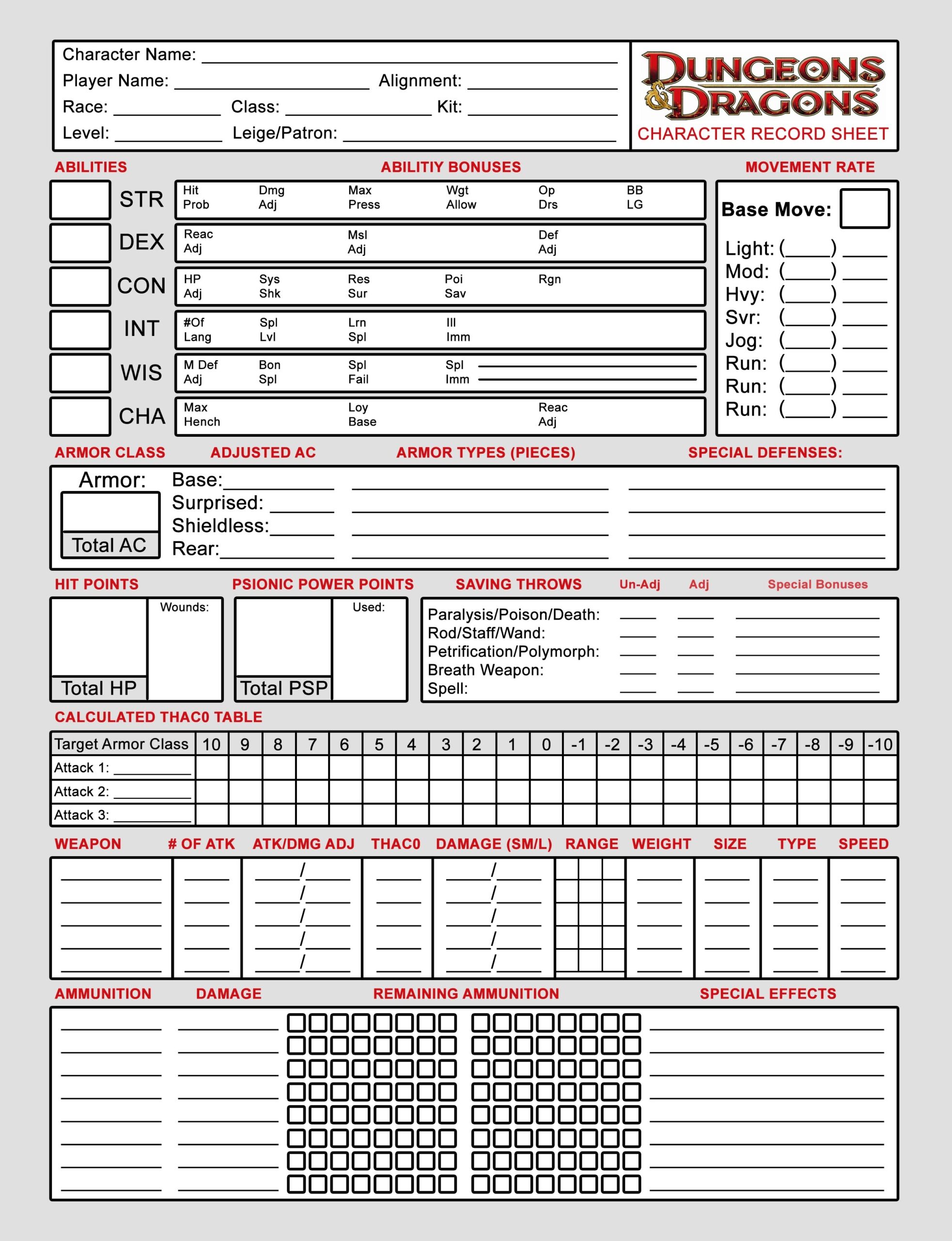 Printable D&D 2nd Edition Character Sheet