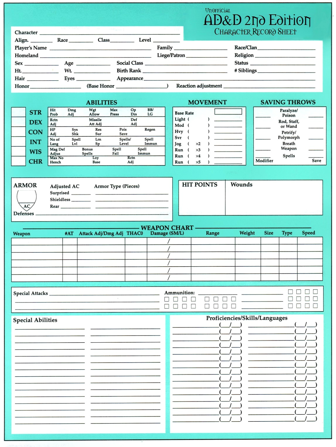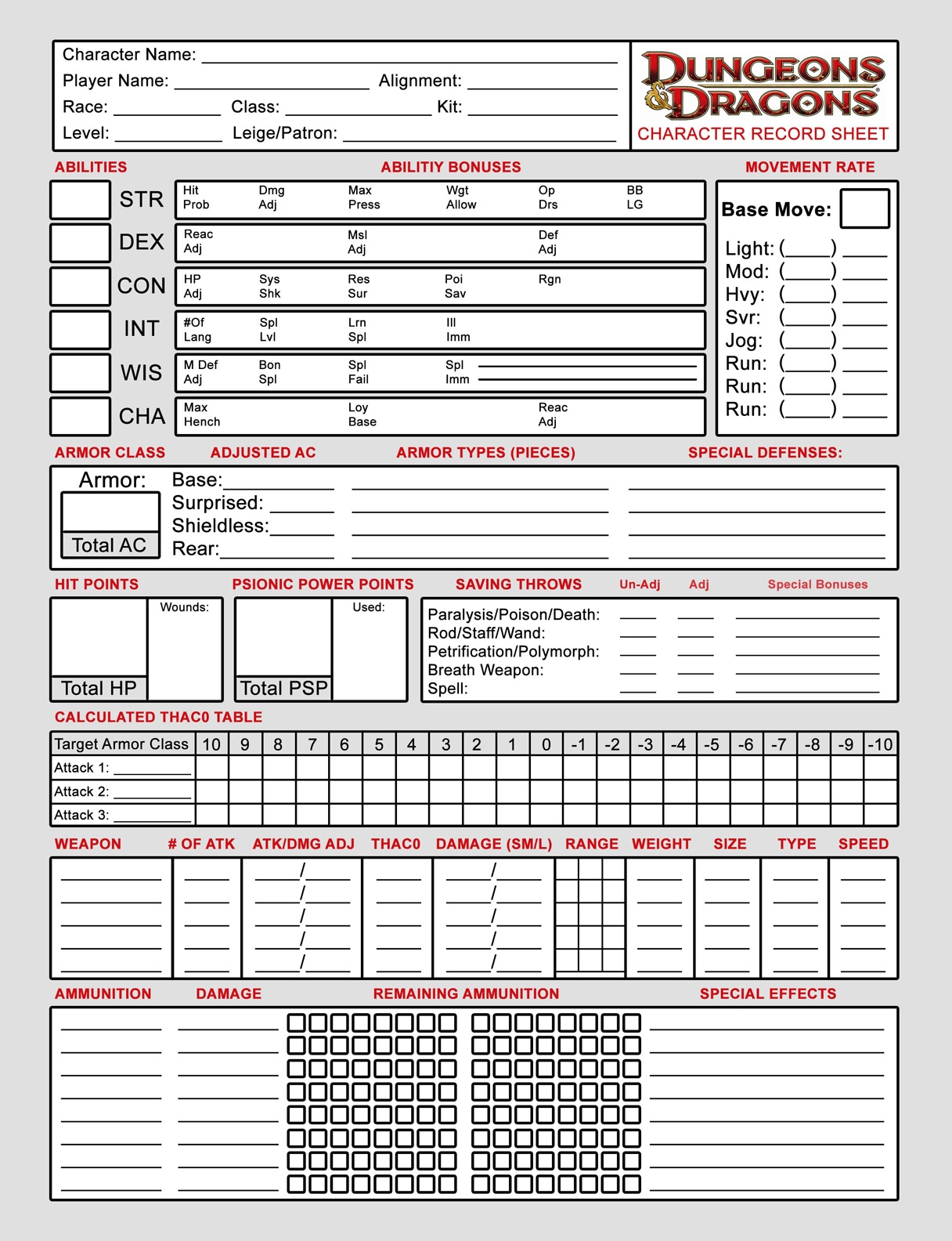 Printable Dungeons And Dragons 2nd Edition Character Sheet