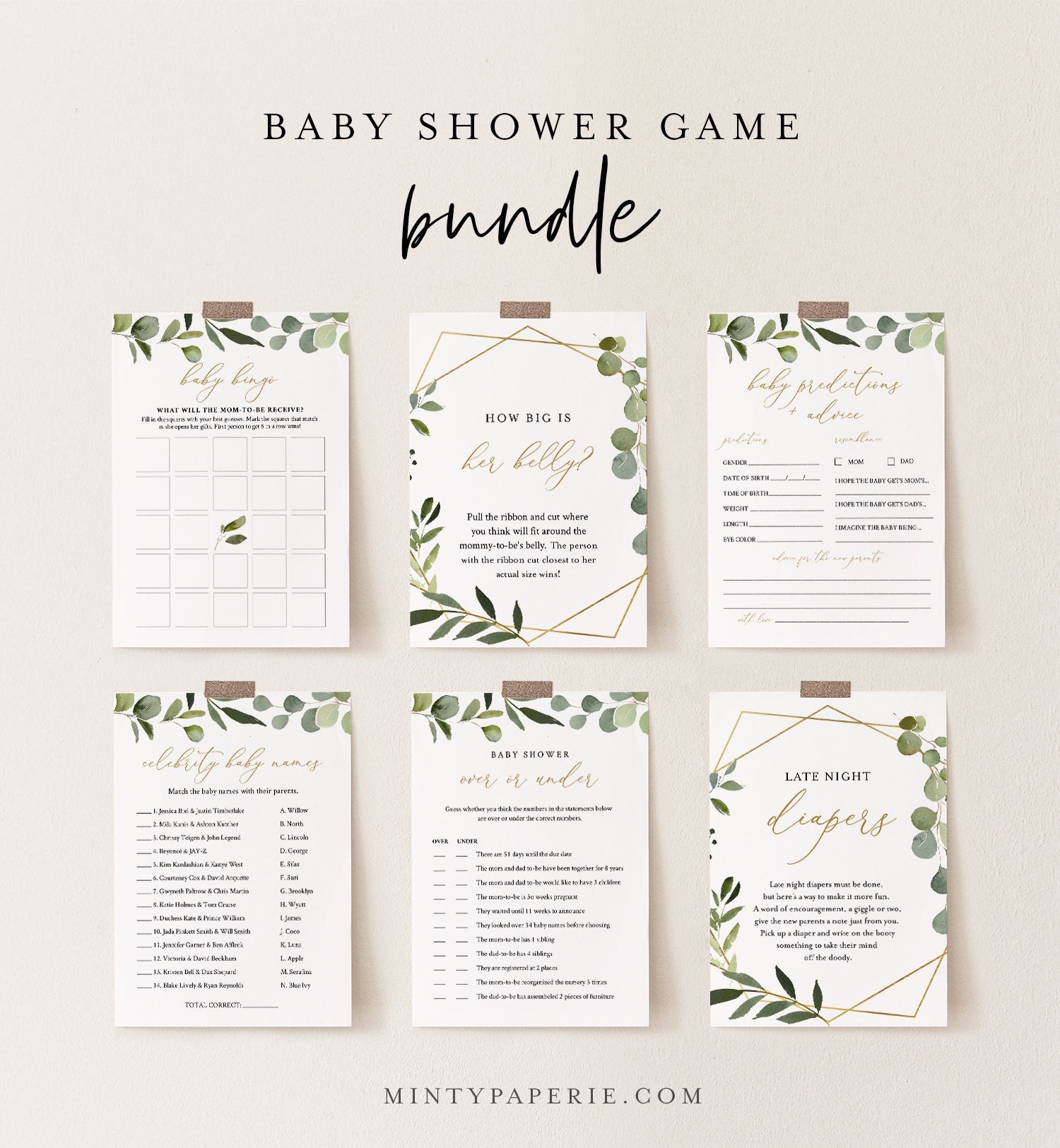 Baby Shower Game Bundle 13 Editable Games INSTANT DOWNLOAD Personalize Questions Greenery Gold Editable Template Templett 056BBGB