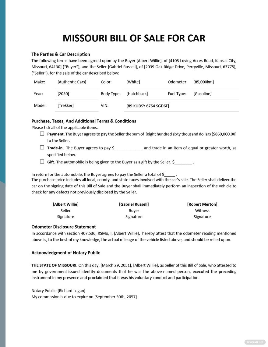 Missouri Used Car Bill Of Sale Form Template In Word PDF Google Docs Download Template