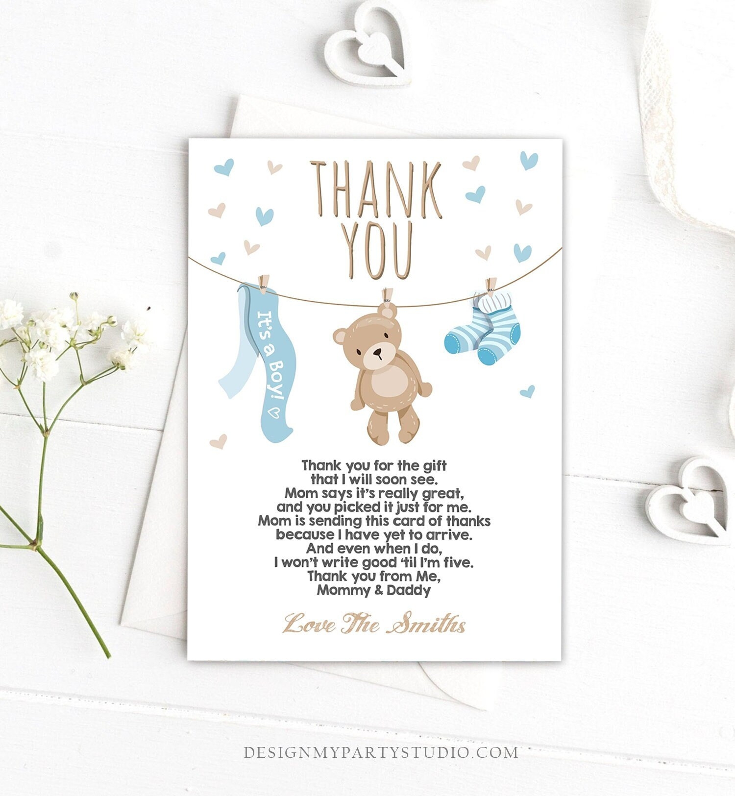 Editable Teddy Bear Thank You Card Baby Shower Thank You Note Boy Blue Woodland Animals Download Digital Corjl Template Printable 0025 Etsy