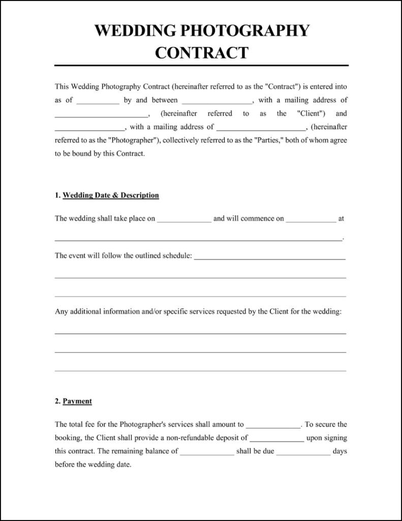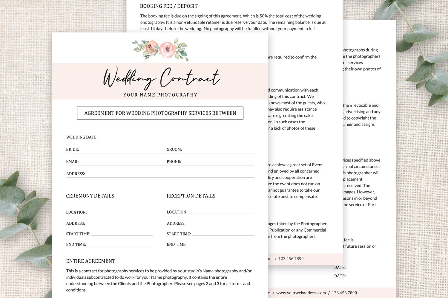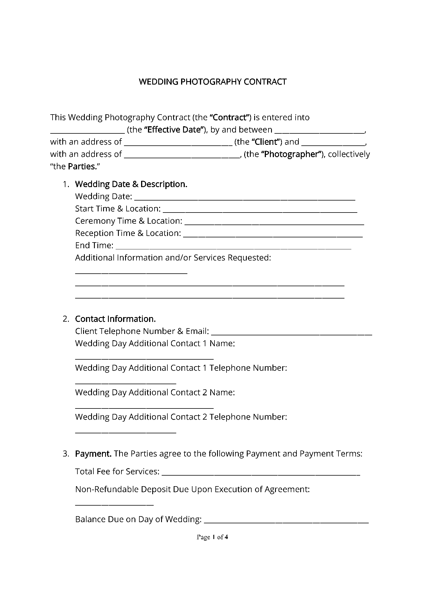 When creating a wedding photography contract, make sure to include important details such as the date, time, and location of the event, as well as the specific services that will be provided. You should also outline the payment schedule, cancellation policy, and any additional fees that may apply.