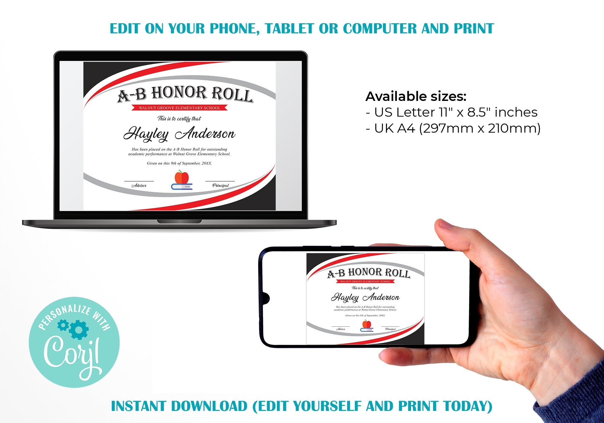 Editable A Honor Roll A B Honor Roll Certificates Printable Class Awards End Of School School Year Customized Awards INSTANT DOWNLOAD Etsy