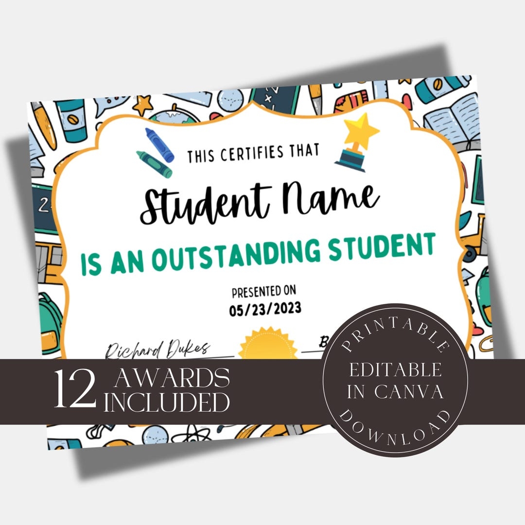 Editable School Certificate Outstanding Student Elementary Classroom Award Certificate Template Printable Graduation Awards Etsy