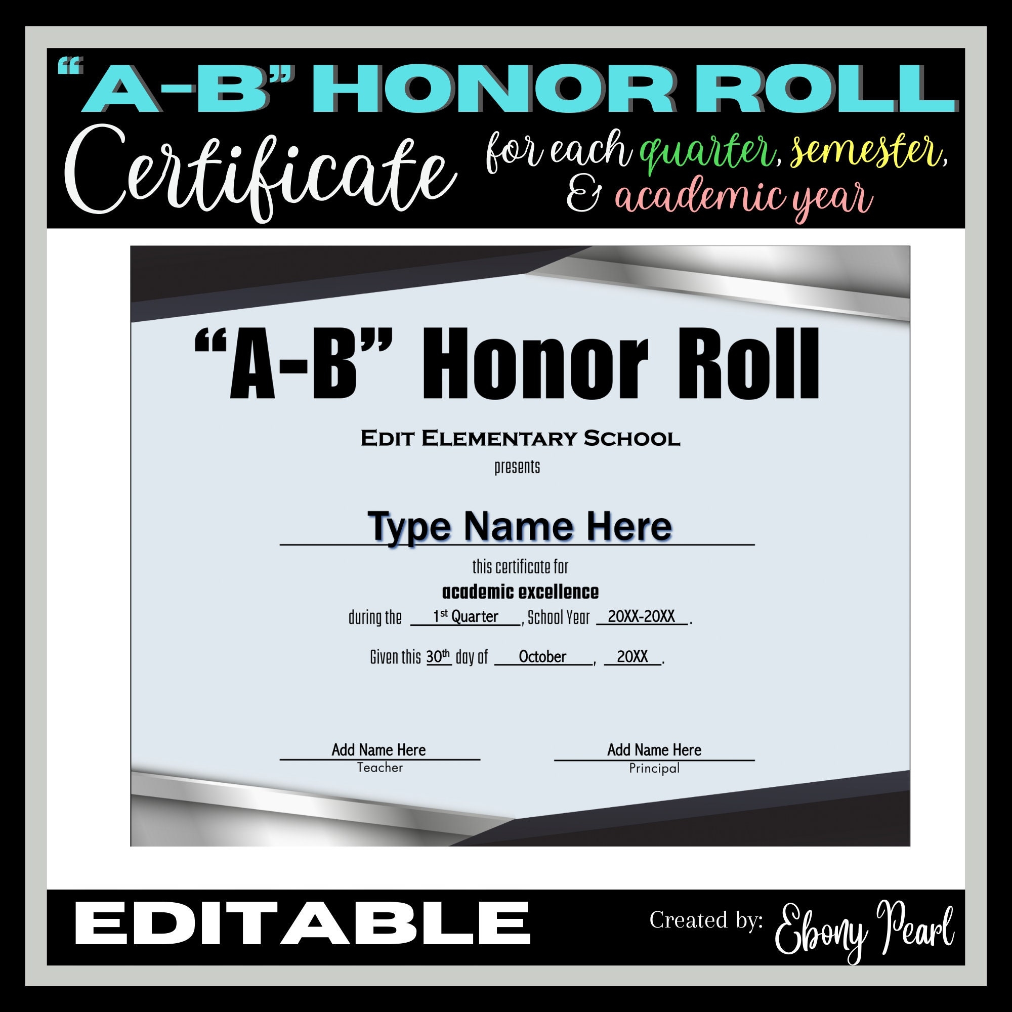 New Editable a b Honor Roll Certificate 1 Each Quarter Semester EOSY Etsy
