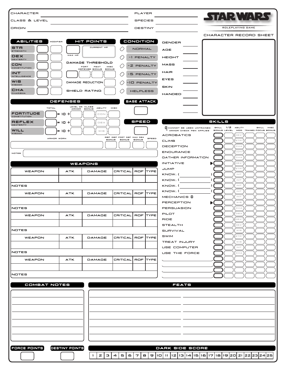 Star Wars Roleplaying Game Character Record Sheet Download Printable PDF Templateroller