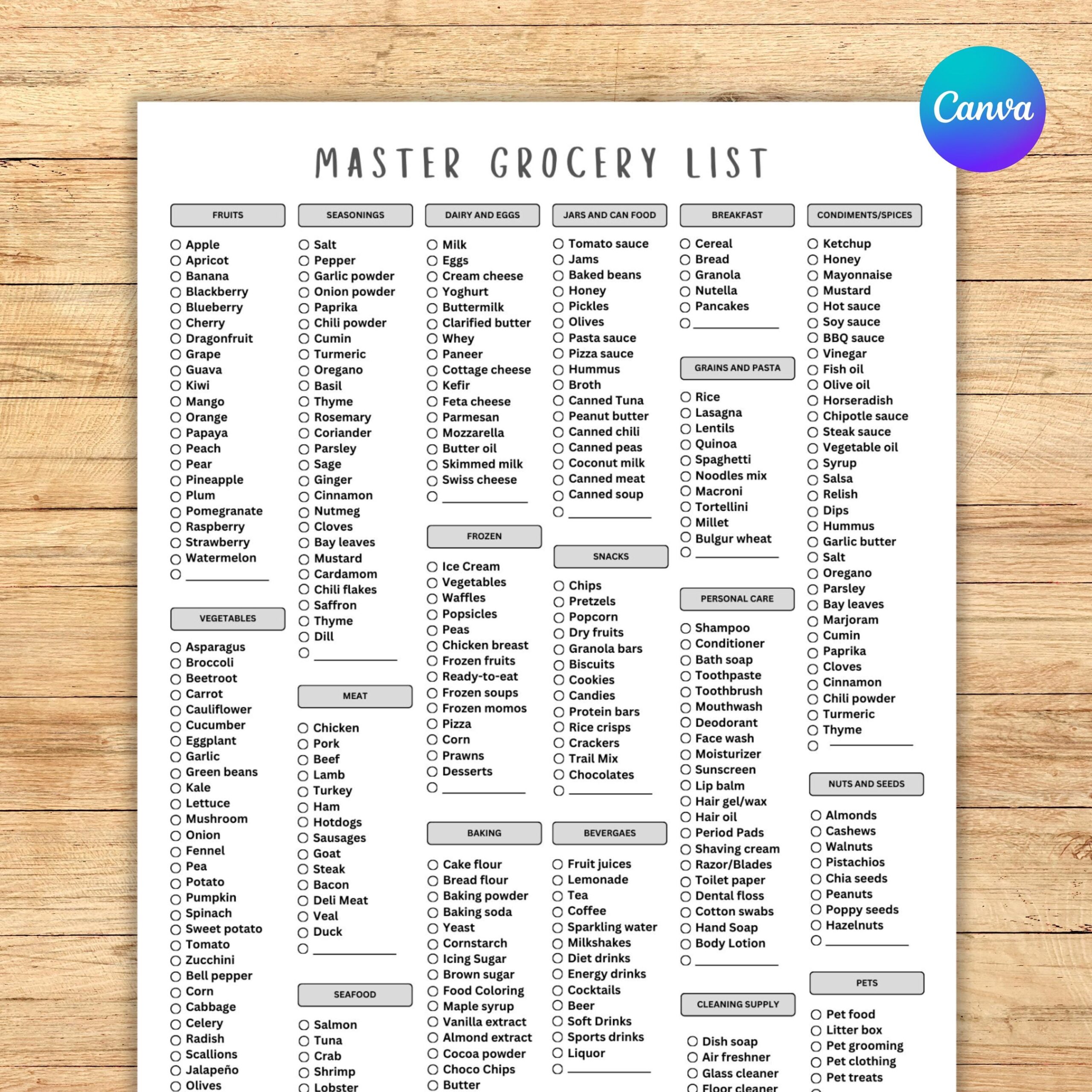 Editable Grocery List Template Colorful Printable Shopping Checklist Master Grocery List Etsy