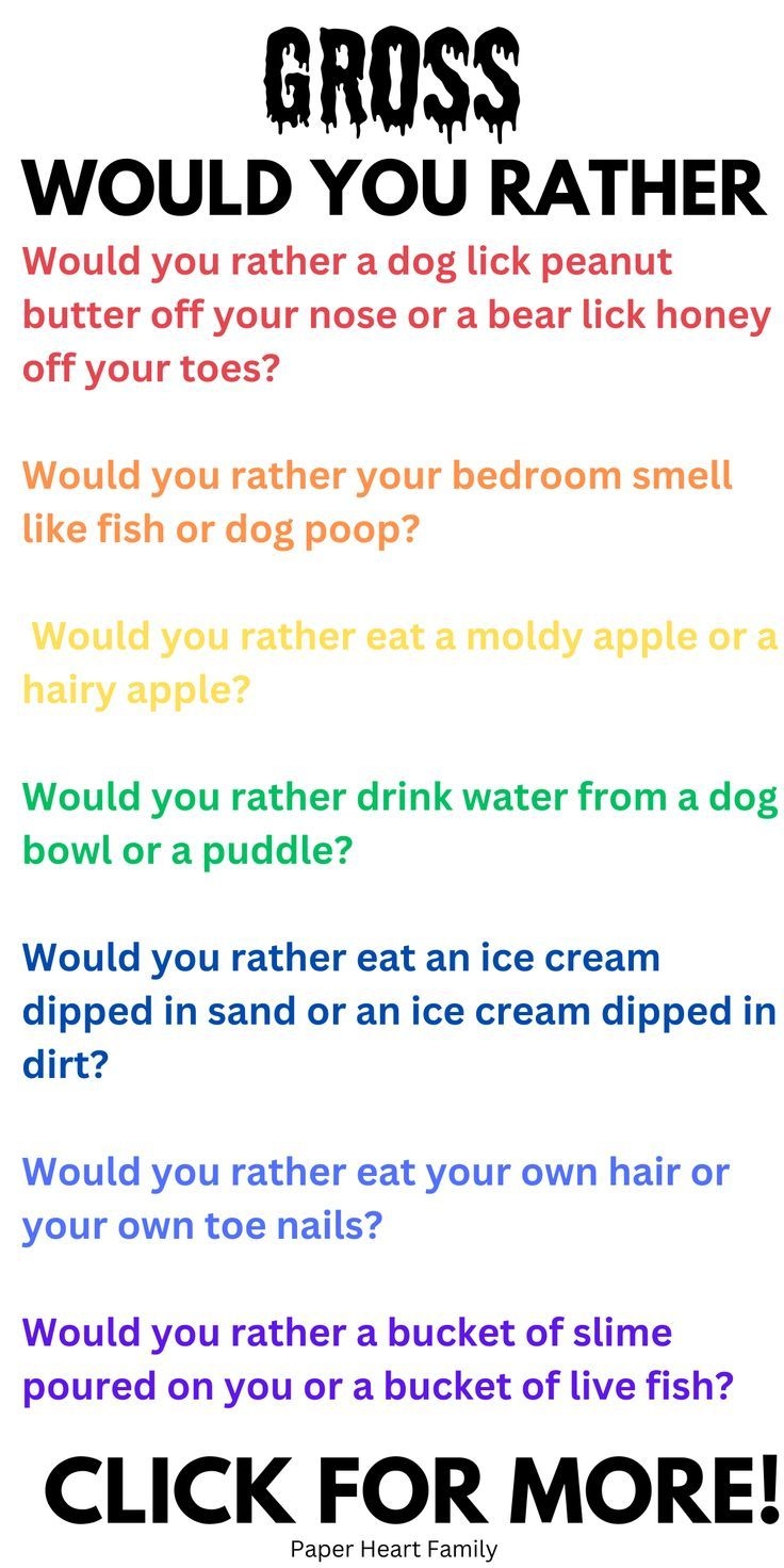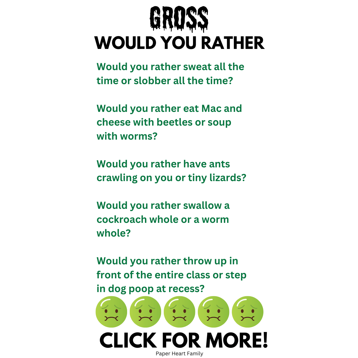 Whether you’re playing with a group of adults or kids, the Would You Rather Printable Gross Edition is sure to be a hit. It’s easy to print out and play anytime, anywhere. Just gather your friends, pick your grossest scenarios, and get ready for a wild and hilarious time.